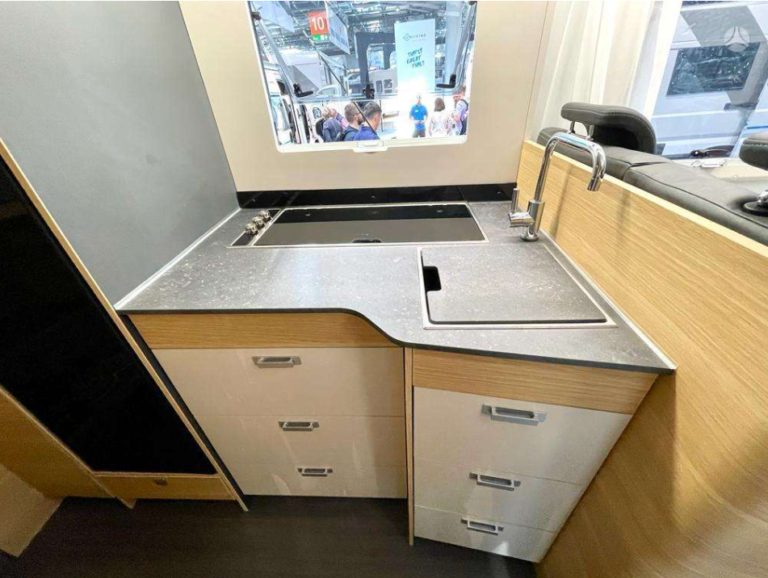 - Fully equipped kitchen: Everything you need for cooking on the move: 3-burner gas stove, sink, large fridge (142 l) with automatic power switch and plenty of storage space.