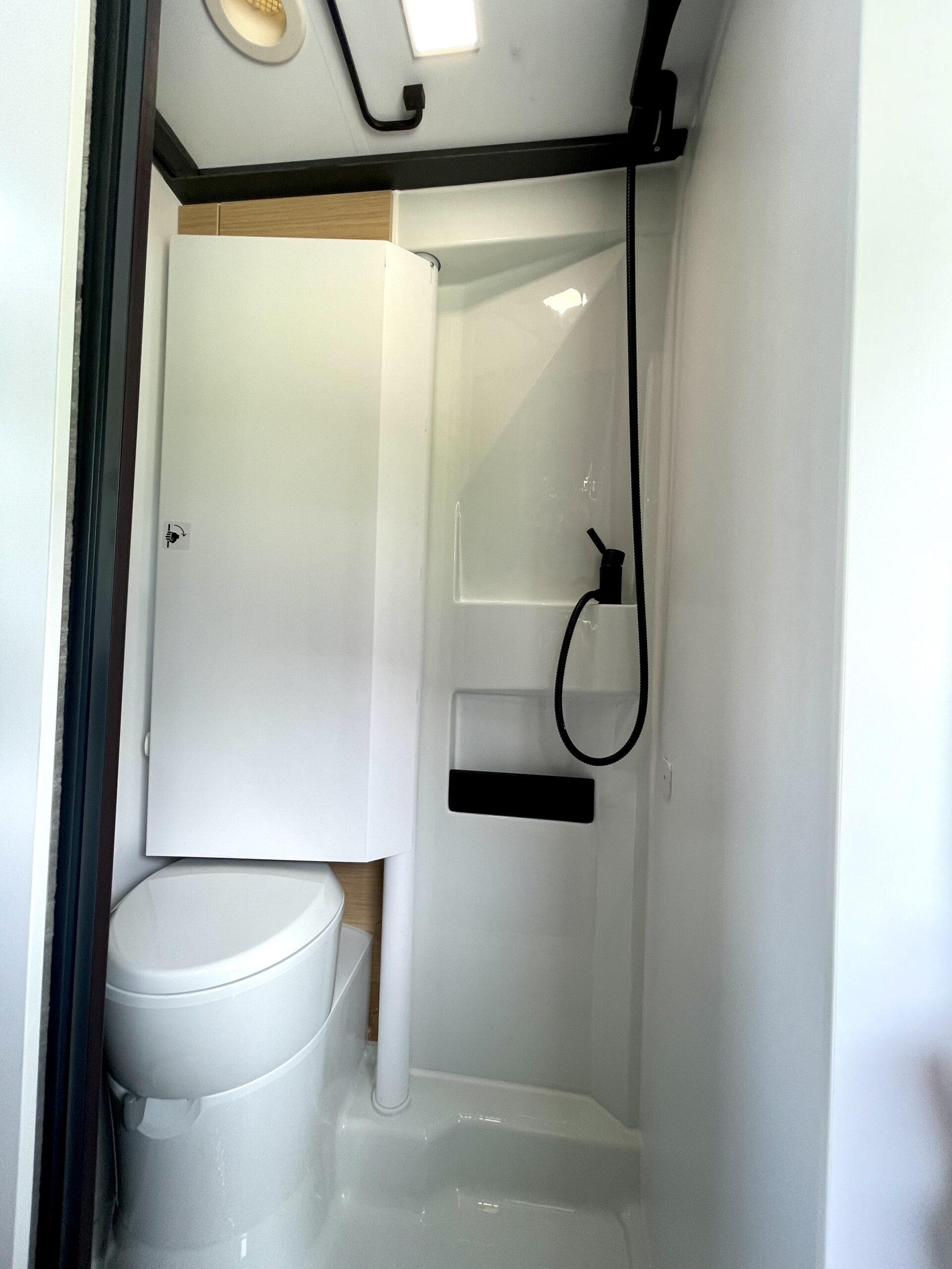 - A spacious shower and toilet with sliding doors ensure privacy and comfort.