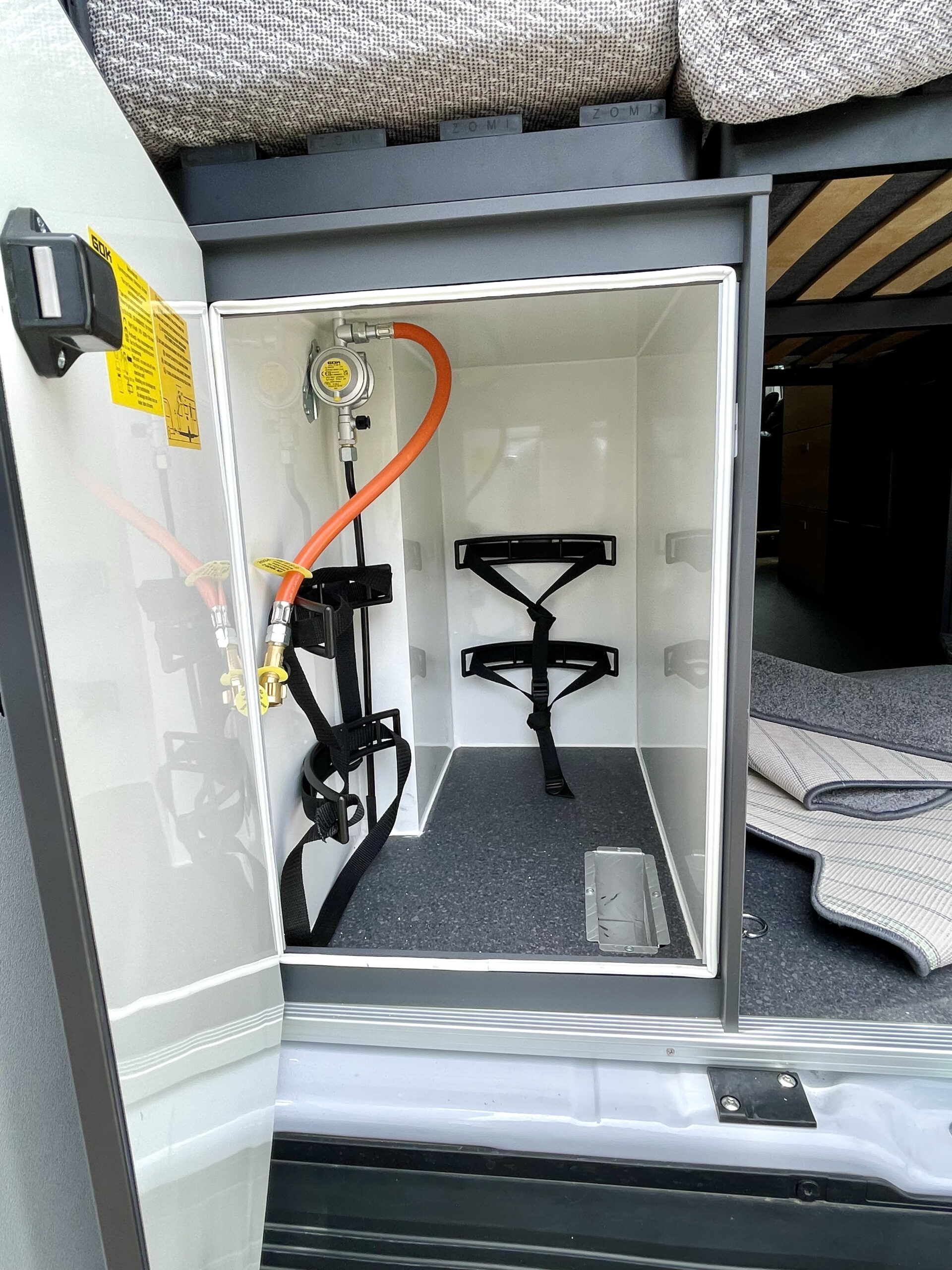 - A functional kitchen with a 2-burner stove, sink and fridge provides everything you need for convenient cooking on the go.