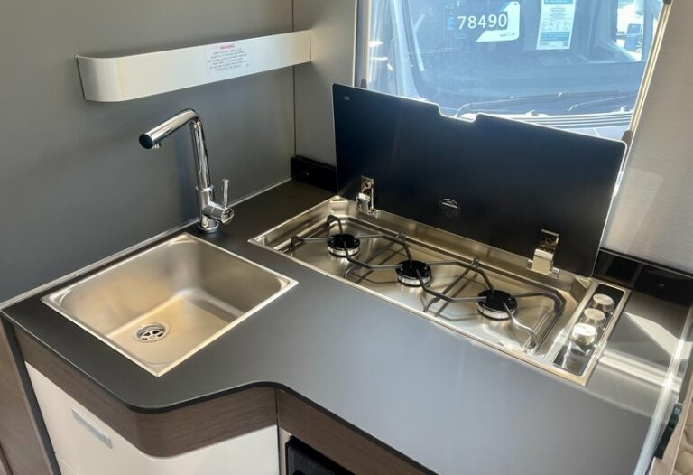 - Kitchen equipment: 3-burner electric cooker with electric ignition, integrated CAN sink with lid, 142 L fridge, oven with grill (Duplex, electric ignition)