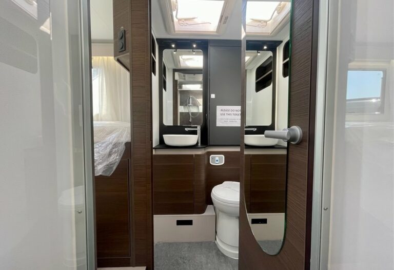 - Bathroom equipment: Chemical toilet (swivel, with passive ventilation), shower cubicle with solid door, separate shower mixer
