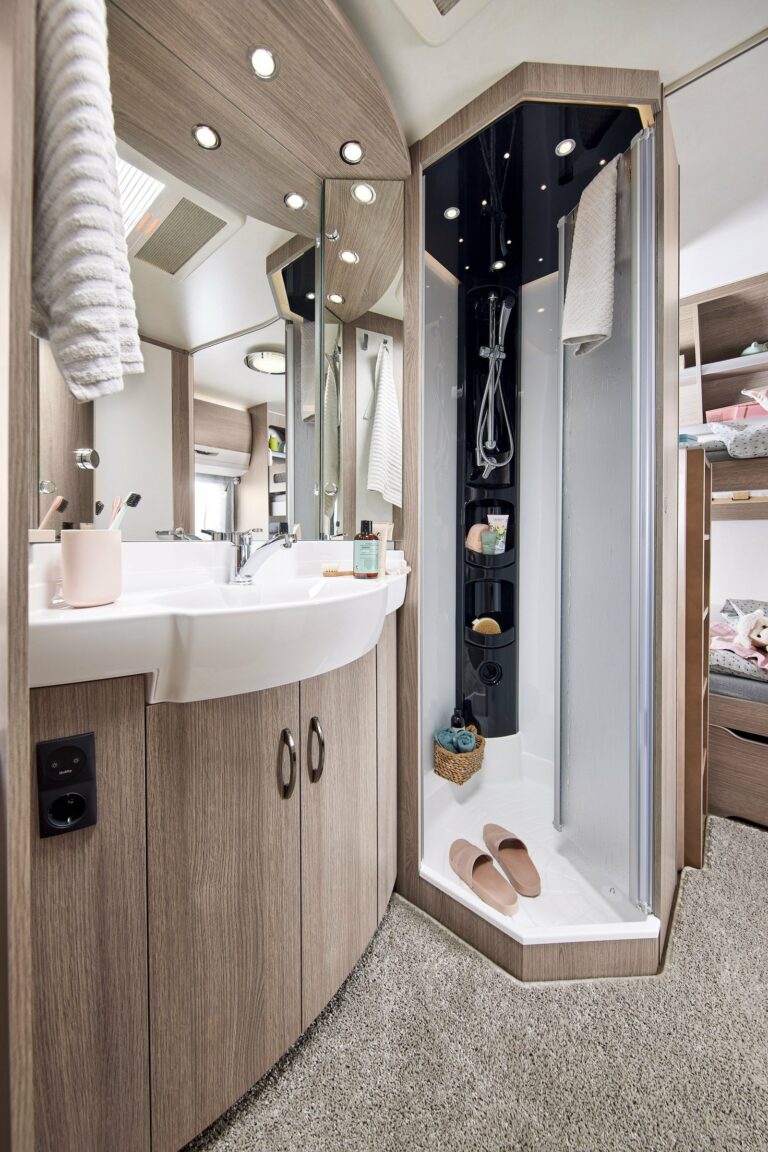 This motorhome offers many practical solutions, such as spacious living and dining areas, a well-equipped fully equipped kitchen, and comfortable bedrooms for a good night's rest after a busy day. The Hobby Prestige 720 UKFe also boasts a spacious bathroom area with modern facilities for even more comfort when travelling.