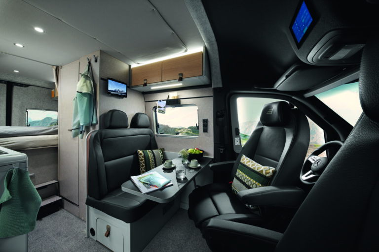 - Mercedes-Benz comfort seats in the living area, height and tilt adjustable, swivel, with 2 armrests and integrated view