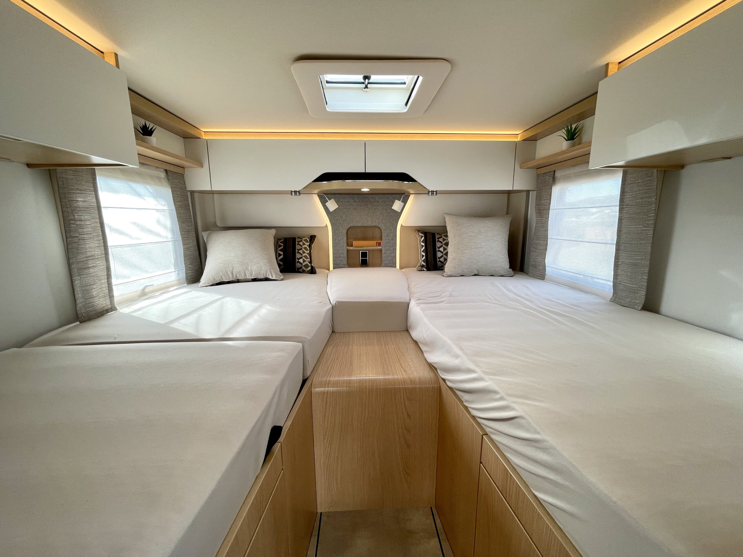 Dvi komfortiškos lovos gale su vieta nešiojamų daiktų laikymui.