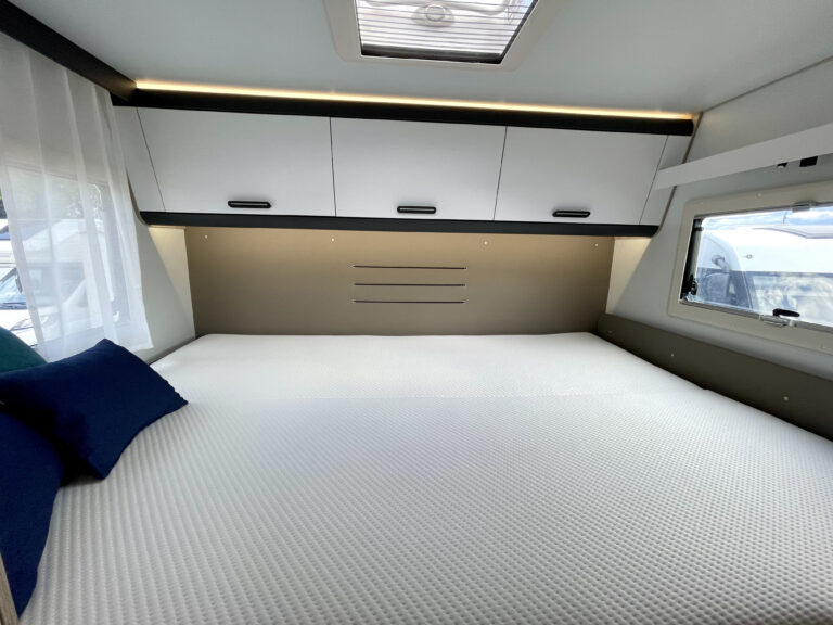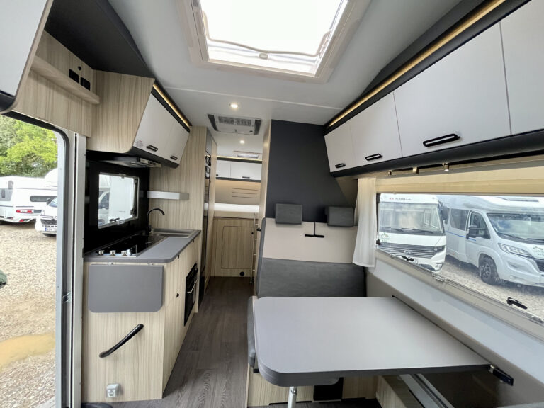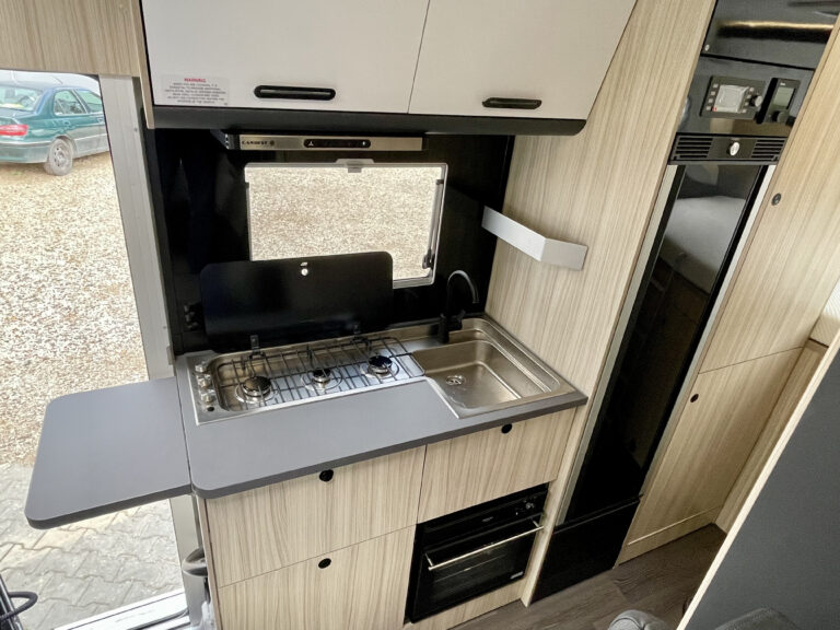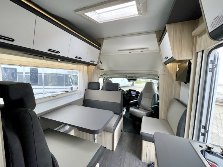 Modernus interjeras: interjeras su NABUCCO CHERRY dekoru ir ALASKA WHITE spintelių durimis sukuria elegantišką ir jaukią atmosferą. Virtuvė su 3 degiklių dujine virykle ir erdviu 142 litrų šaldytuvu leidžia lengvai gaminti maistą kelyje. Cheminis WC ir atskira dušo kabina užtikrina, kad turėsite visus reikalingus patogumus, nepriklausomai nuo jūsų kelionės tikslo.