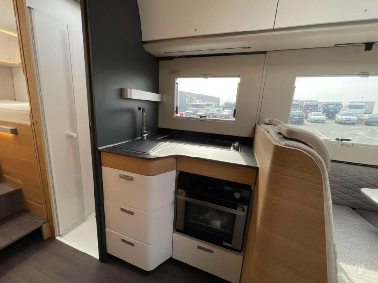 • Повністю обладнана кухня: Все необхідне для приготування їжі в дорозі: сучасний холодильник, плита з 3 конфорками, мийка, духовка з функцією гриля та багато місця для зберігання речей.