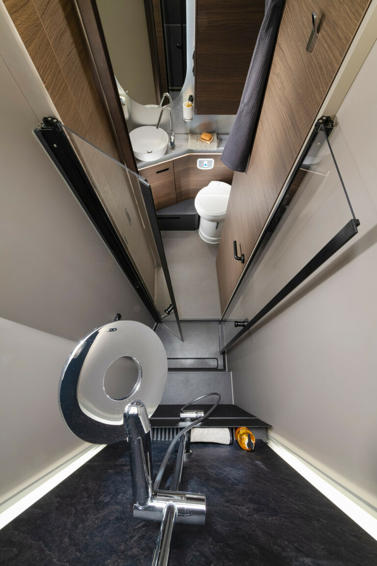 - Устаткування для ванної кімнати: Хімічний туалет (поворотний, з пасивною вентиляцією), душова кабіна з суцільними дверима, окремий змішувач для душу