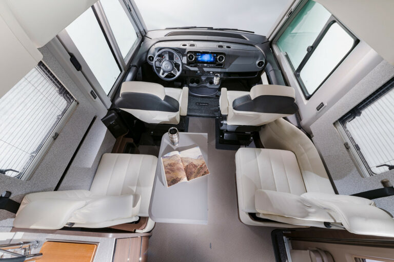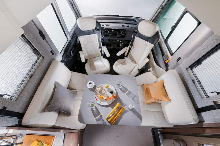 SUPER SONIC 780 DL Він має розкішний інтер'єр з чотирма спальними місцями та зручну кухню. Заднє двоспальне ліжко та електричне розкладне ліжко спереду забезпечують комфорт навіть під час тривалих подорожей. Стильний та функціональний інтер'єр, оздоблений матеріалами найвищої якості, створює затишну атмосферу, в якій можна відпочити після пригод дня.